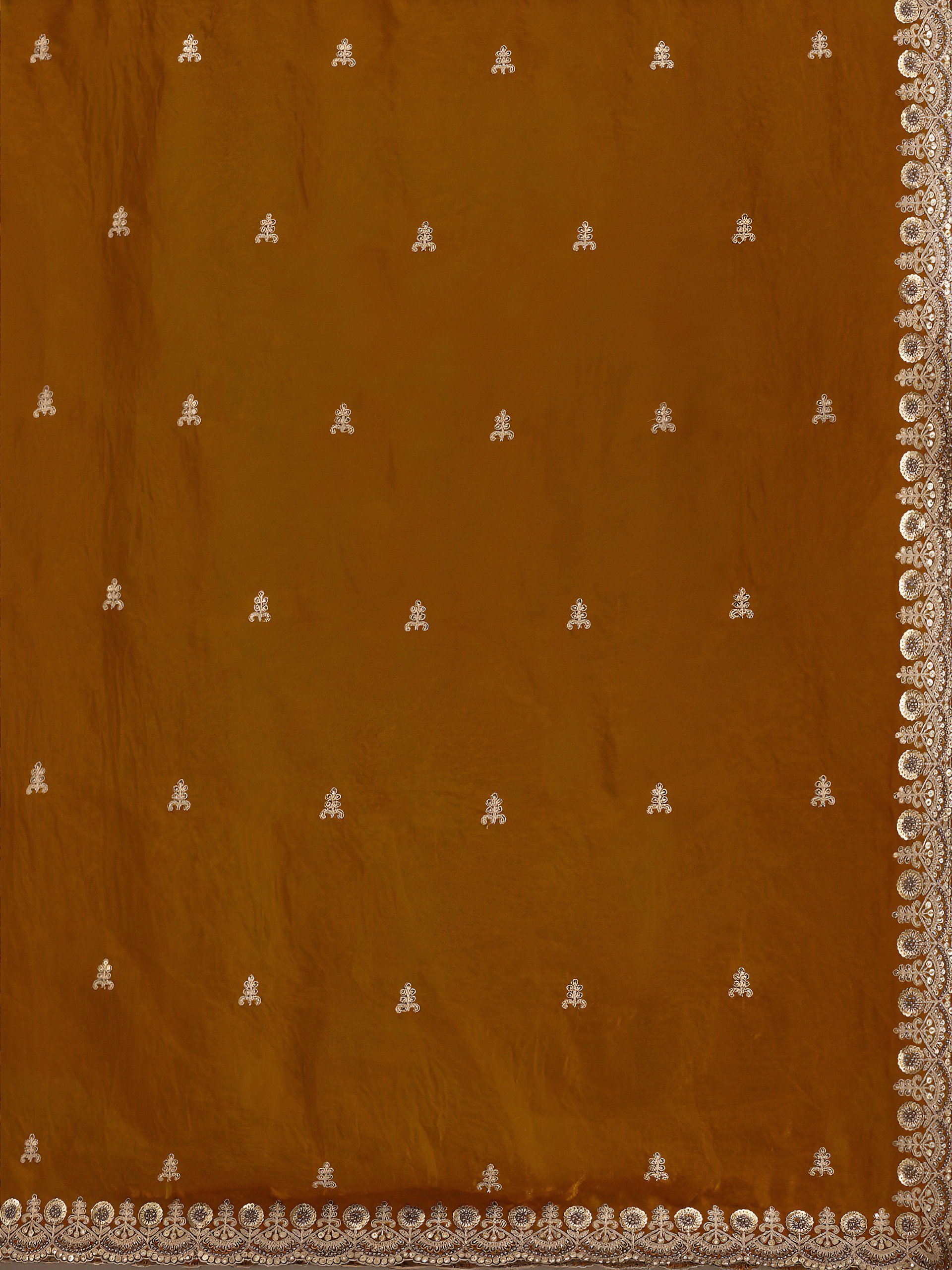 Experience royal charm with this exquisite tissue saree, beautifully adorned with intricate multi-sequence, dori, and zari embroidery. Enhanced with diamond and pearl work, the saree reflects a perfect blend of tradition and modern sophistication. Paired with an unstitched blouse, it allows customization for the perfect fit and style.